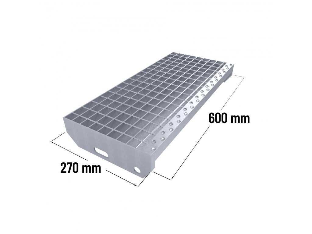 Schodišťový stupeň svařovaný o rozměru 600mm x 270mm. Materiál ocel S235 žárově zinkovaná. Barva šedá-zinek.